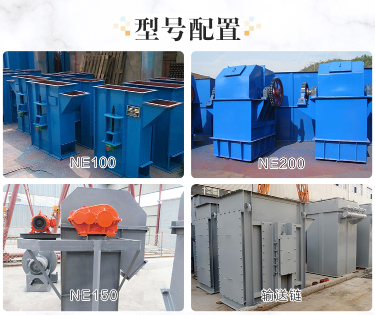 散裝物料板鏈鬥式提升機擁有大小不同的11種型號以及不同配置,型號有NE15、NE30、NE50 、NE100、NE150、NE200、NE300、NE400、NE500、NE600、NE800等,不同大小型號的提升機配置(料鬥、鏈條、振動電機)選用的都不同所以價格也會有所不同,提升產量越大所選擇的料鬥規格與電機功率也就越大。