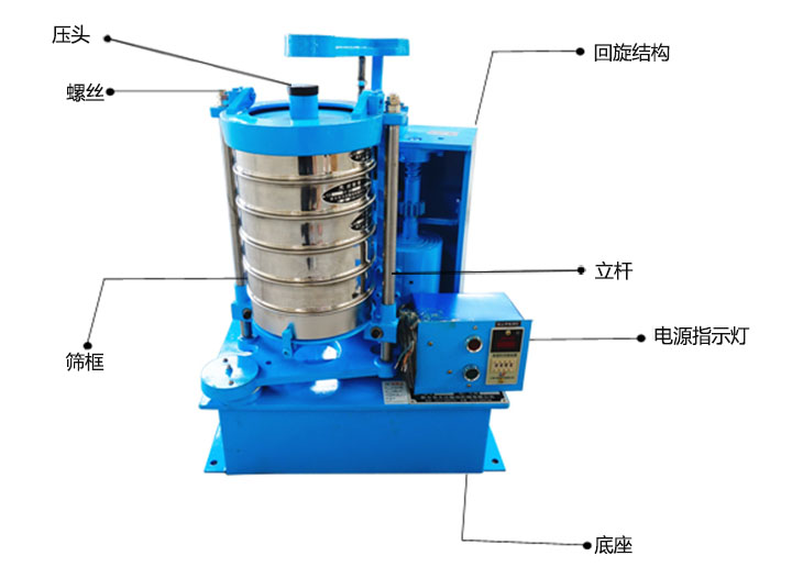 圓手柄,緊固手柄,壓頭,立杆,篩具,螺母,托盤,振動體,彈簧,彈簧座,底筒,地腳,殼體,振動電機 ,繼電器。