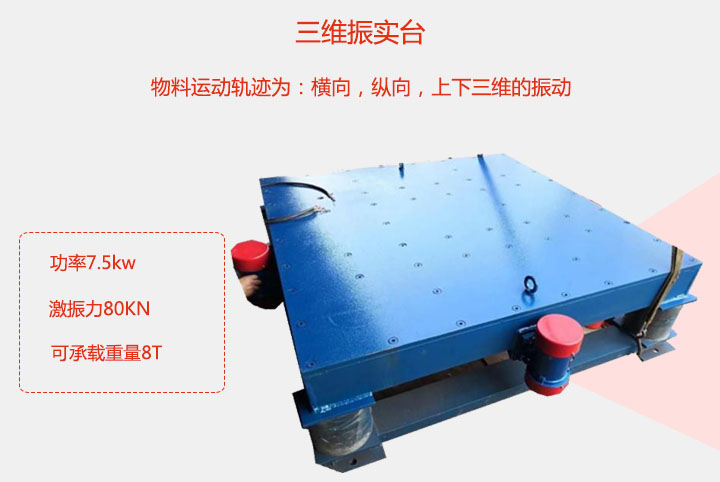 三維振實台常用於混凝土,預製件試塊,樹脂砂,消失模的造型,可通過調節電機激振力大小使平台上物料實現理想的形式。